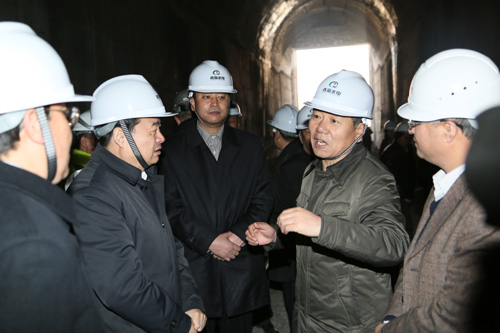 當天中午12時,郝鵬省長、馬順清、嚴金海副省長率領高華秘書長、張文華副秘書長,以及省總工會、省發改委、省政府辦公廳的有關負責同志,來到引大濟湟工程現場調研。調水總干渠是“引大濟湟”的控制性輸水工程。在大坂山北坡的總干渠進口,省領導踩著沙礫,走進隧洞,詳細了解工程每天的掘進情況。了解到卡機脫困這個長期制約工程進度的突出難題得到有效解決,項目建設正在扎實有序推進時,郝鵬十分高興,他指出,一定要加大現場協調力度,狠抓施工關鍵環節,努力破解技術難題,盡快實現人工鉆爆和TBM機相結合的掘進,在確保工程質量和安全的前提下,一米一米地倒排工期,加快工程進度,早日將剩余約8千米貫通。隨后,郝鵬省長向青海水電集團駐工地一線代表頒發了省委省政府春節慰問金。